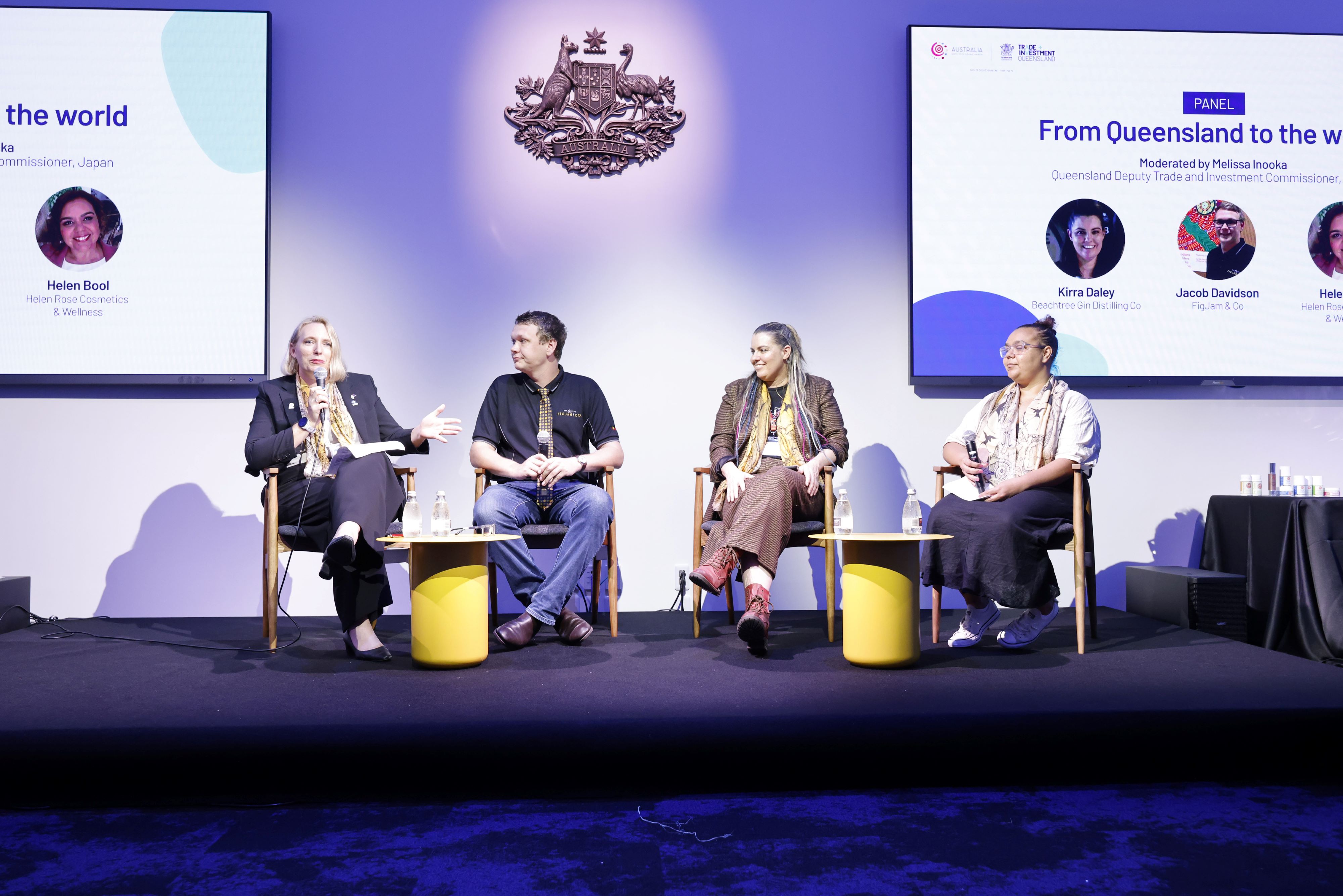 Queensland’s Deputy Trade and Investment Commissioner for Japan, Melissa Inooka, led a compelling panel discussion spotlighting three pioneering First Nations entrepreneurs: Jacob Davidson, founder of FigJam & Co, Helen Bool, founder of Helen Rose Cosmetics and Wellness, and Kirra Daley, co-founder of Beachtree Distilling Co.
